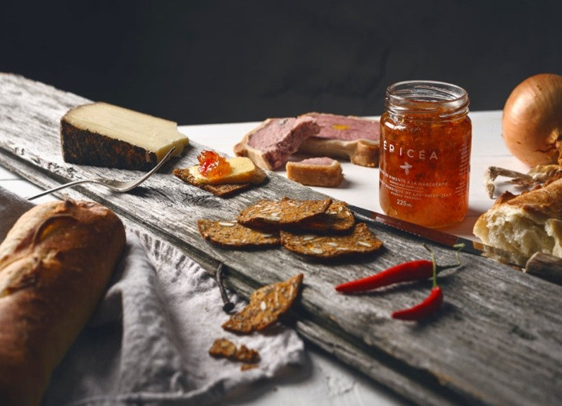Cette gelée est un exemple parfait d’une symbiose entre un aliment, le poivron, et une fleur, la marguerite. La marguerite donne des nuances raffinées et surprenantes. Ce produit est idéal pour tartiner les canapés et accompagner les fromages crémeux à pâte molle comme le brie.