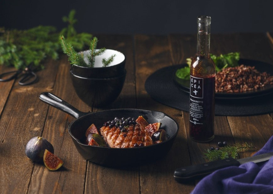 Le mariage entre l’épinette noire et le bleuet donne à ce produit une saveur se rapprochant du vinaigre balsamique. Son côté corsé est tout désigné pour mariner, sauter et déglacer les viandes rouges et principalement le gibier, dont le goût est plus prononcé. On peut même lui attribuer certaines vertus pour la santé puisque le bleuet est un antioxydant naturel.